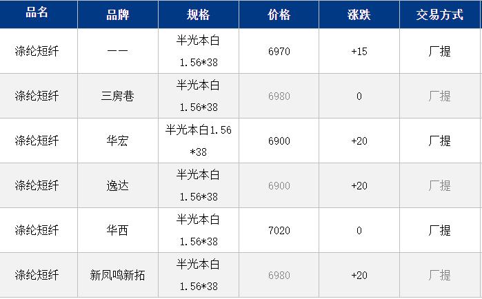 1.4D半光直紡滌綸短纖江浙商談重心6950-7100元/噸出廠或短送,福建7050-7100元/噸附近短送,山東、河北主流7000-7150元/噸送到。