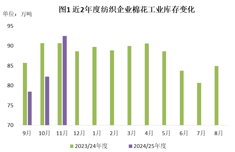月內(nèi)隨著新棉加工持續(xù)進(jìn)行,性價(jià)比高的現(xiàn)貨資源得到補(bǔ)充,紡織廠逢低補(bǔ)庫(kù),原料庫(kù)存小幅上升。截至11月30日,紡織廠在庫(kù)棉花工業(yè)庫(kù)存量為92.5萬噸,環(huán)比增加10.3萬噸,同比增加1.8萬噸。其中36%企業(yè)增加棉花庫(kù)存,24%減少庫(kù)存,40%基本保持不變。