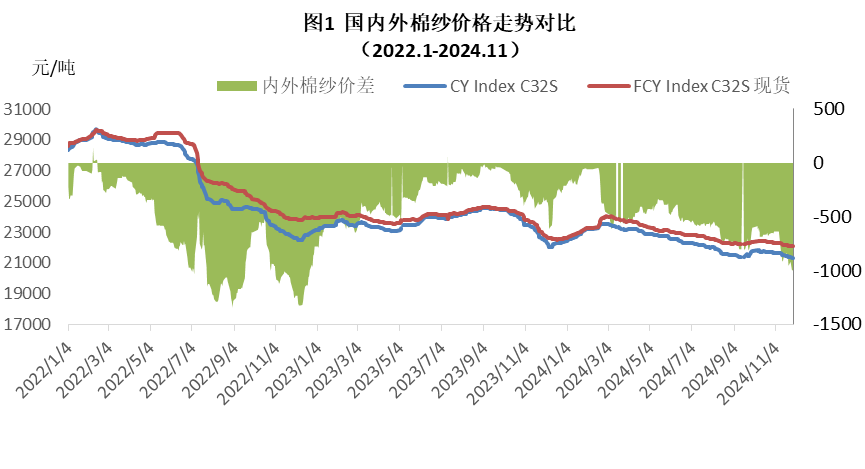 本月內(nèi)外棉紗價(jià)格均價(jià)下跌,國(guó)產(chǎn)32支純棉紗11月均價(jià)21495元/噸,環(huán)比下跌222元,跌幅1.02%,同比下跌1624元/噸,跌幅7%;進(jìn)口32支純棉紗11月均價(jià)22186元/噸,環(huán)比下跌182元,跌幅0.8%,同比下跌1281元,跌幅5.5%。