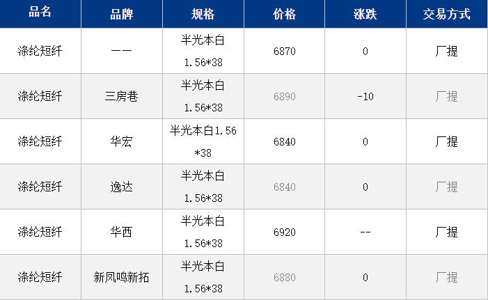 1.4D半光直紡滌綸短纖江浙商談重心6800-7050元/噸出廠或短送,福建7050-7150元/噸附近短送,山東、河北主流6900-7150元/噸送到。