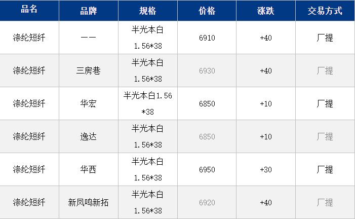1.4D半光直紡滌綸短纖江浙商談重心6900-7100元/噸出廠或短送,福建7050-7150元/噸附近短送,山東、河北主流6950-7150元/噸送到。