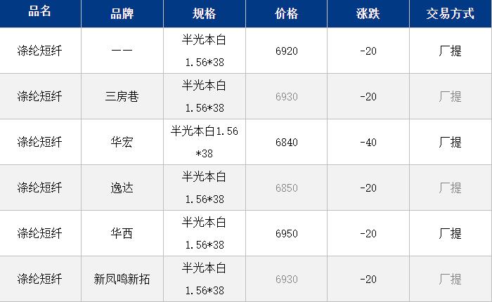 1.4D半光直紡滌綸短纖江浙商談重心6850-7100元/噸出廠或短送,福建7100-7150元/噸附近短送,山東、河北主流6950-7150元/噸送到。