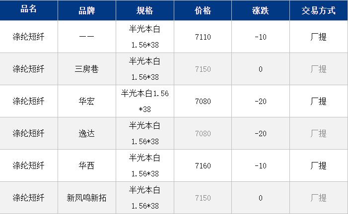 1.4D半光直紡滌綸短纖江浙商談重心7050-7250元/噸出廠或短送,福建7300-7350元/噸附近短送,山東、河北主流7100-7300元/噸送到。