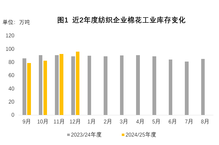 12月,國內(nèi)棉紡織需求持續(xù)走弱,企業(yè)銷售轉(zhuǎn)淡,成品庫存不斷增加,對春節(jié)后訂單信心不足,部分企業(yè)通過下調(diào)產(chǎn)能以應(yīng)對經(jīng)營壓力,全月棉紗和棉布產(chǎn)量有所下降。月內(nèi)棉價(jià)下跌,紗線企業(yè)逢低采購,原料庫存略有上升。據(jù)中國棉花預(yù)警系統(tǒng)對全國90余家定點(diǎn)紡織廠調(diào)查顯示,本月紡織廠開工及產(chǎn)能環(huán)比略有下降,成品累庫現(xiàn)象加重,棉紗價(jià)格持續(xù)下跌,棉花庫存有所上升。