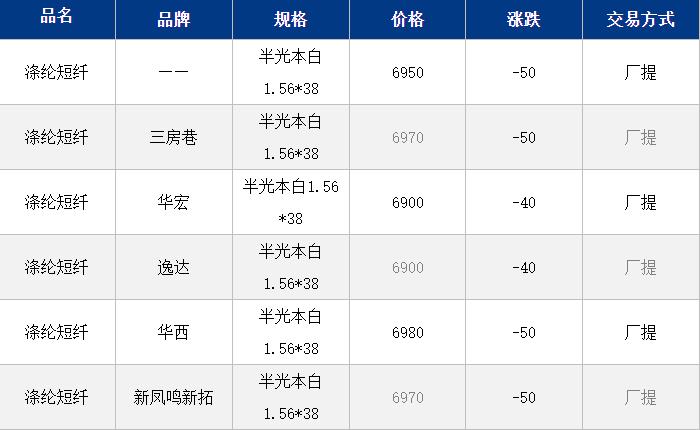 江蘇滌綸短纖現(xiàn)貨價格下跌50元在6950元/噸。成本支撐轉(zhuǎn)弱,上午短纖價格弱勢下跌;早間工廠價格多下調(diào)50-100元/噸,貿(mào)易商價格集中在6950-6980元/噸,偏低6900元/噸附近。