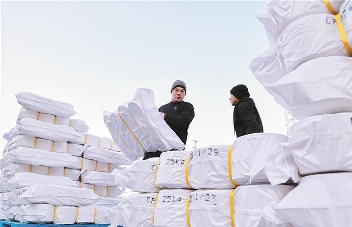 2月13日,在位于鐵門關(guān)經(jīng)濟技術(shù)開發(fā)區(qū)的新疆九色鹿紡織有限公司,工人將棉紗產(chǎn)品裝車。今年以來,借助訂單量持續(xù)增長的好勢頭,該公司鉚足干勁抓生產(chǎn)、拓市場,計劃全年生產(chǎn)棉紗產(chǎn)品1.4萬噸,實現(xiàn)產(chǎn)值近3億元。