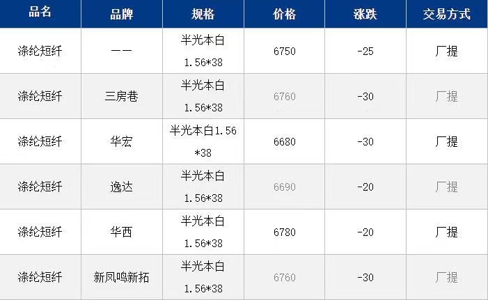 1.4D半光直紡滌綸短纖江浙商談重心6650-6900元/噸出廠或短送,福建6850-6900元/噸附近短送。