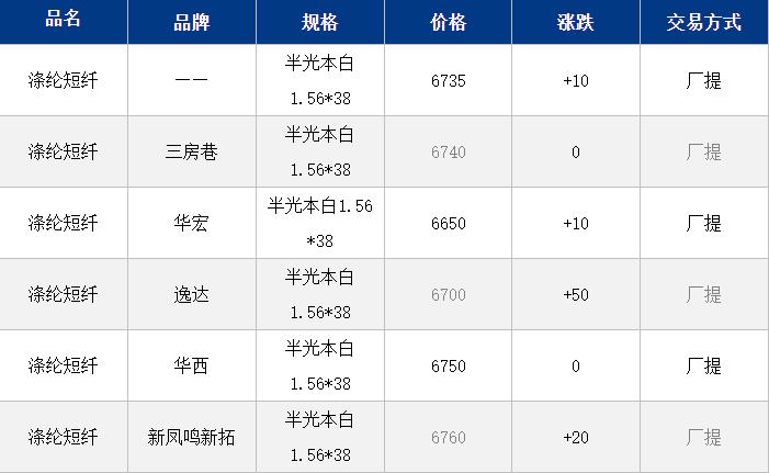 1.4D半光直紡滌綸短纖江浙商談重心6650-6900元/噸出廠或短送,福建6950元/噸附近短送,山東、河北主流6750-7000元/噸送到。