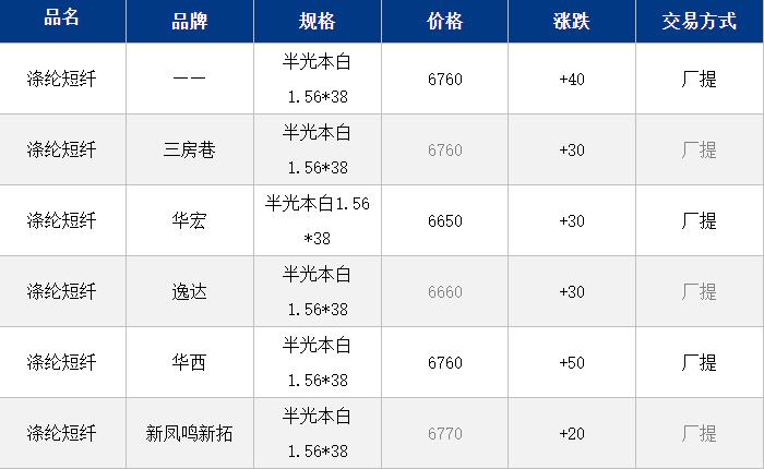 1.4D半光直紡滌綸短纖江浙商談重心6700-6850元/噸出廠或短送,福建68000-6900元/噸附近短送,山東、河北主流6750-7000元/噸送到。