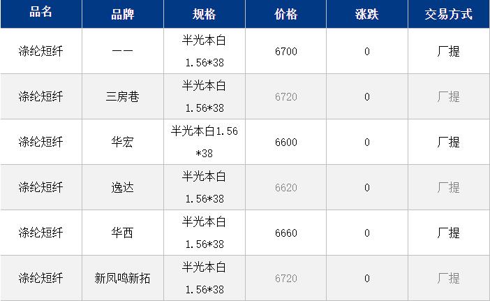1.4D半光直紡滌綸短纖江浙商談重心6600-6850元/噸出廠或短送,福建6800-6900元/噸附近短送,山東、河北主流6700-6950元/噸送到。