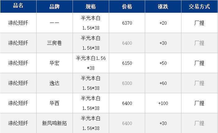 1.4D半光直紡滌綸短纖江浙商談重心6200-6450元/噸出廠或短送,福建6400-6500元/噸附近短送,山東、河北主流6300-6550元/噸送到。