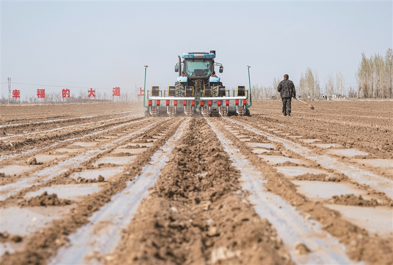 4月9日,呼圖壁縣五工臺(tái)鎮(zhèn)十九戶村,農(nóng)戶在用北斗衛(wèi)星導(dǎo)航無人駕駛拖拉機(jī)播種棉花。據(jù)了解,今年呼圖壁縣計(jì)劃種植棉花55萬畝,各鄉(xiāng)(鎮(zhèn))組織專業(yè)技術(shù)人員深入田間地頭做好全程技術(shù)指導(dǎo),為棉花播種做好有力保障。近年來,呼圖壁縣大力推廣衛(wèi)星導(dǎo)航、無人機(jī)飛防、智能施肥系統(tǒng)等新技術(shù)新機(jī)具,提高春耕生產(chǎn)農(nóng)機(jī)作業(yè)質(zhì)量和作業(yè)效率。
