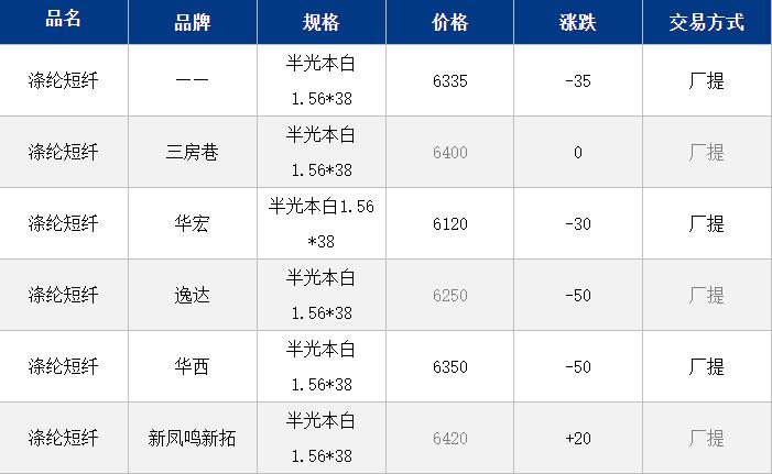 1.4D半光直紡滌綸短纖江浙商談重心6150-6450元/噸出廠或短送,福建6400-6500元/噸附近短送,山東、河北主流6250-6550元/噸送到。