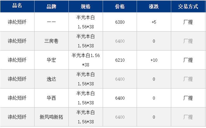 1.4D半光直紡滌綸短纖江浙商談重心6200-6500元/噸出廠或短送,福建6350-6450元/噸附近短送,山東、河北主流6350-6550元/噸送到。