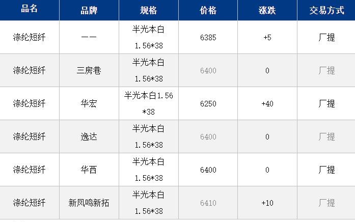 1.4D半光直紡滌綸短纖江浙商談重心6250-6550元/噸出廠或短送,福建6450-6550元/噸附近短送,山東、河北主流6400-6600元/噸送到。