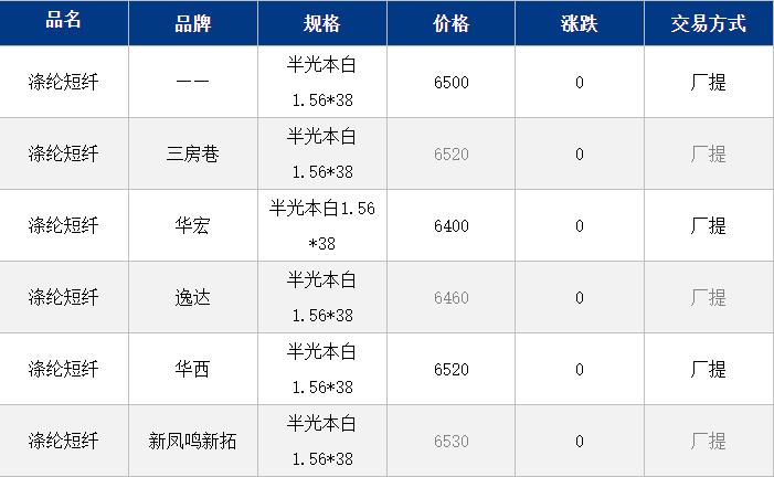 1.4D半光直紡滌綸短纖江浙商談重心6450-6750元/噸出廠或短送,福建主流報6750-6850元/噸現(xiàn)款短送,成交商談6550-6700元/噸現(xiàn)款短送,山東、河北主流6450-6800元/噸送到。