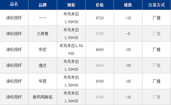 江蘇滌綸短纖現(xiàn)貨價格下跌10元到6710元/噸;目前現(xiàn)貨主流6700-6730元/噸自提,偏高6750元/噸,偏低6580元/噸附近。