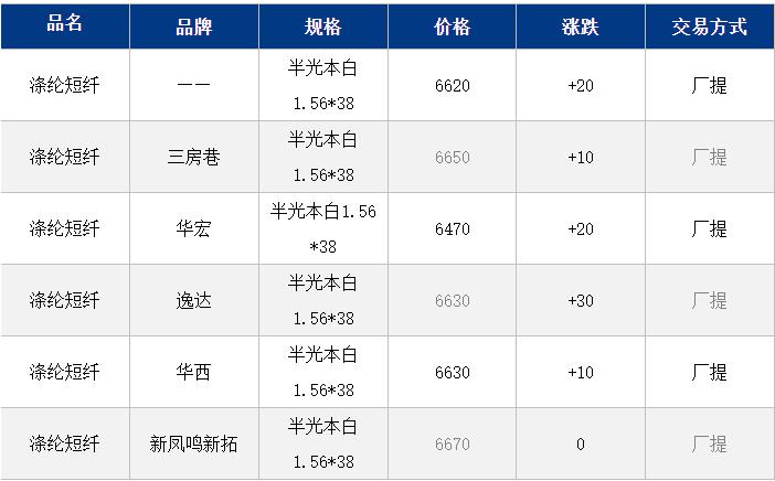 1.4D半光直紡滌綸短纖江浙商談重心6500-6750元/噸出廠或短送,福建主流商談6450-6600元/噸現(xiàn)款短送,山東、河北主流6600-6800元/噸送到。