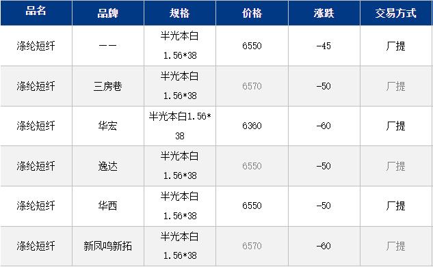 1.4D半光直紡滌綸短纖江浙商談重心6400-6750元/噸出廠或短送,福建主流商談6450-6600元/噸現(xiàn)款短送,山東、河北主流6500-6800元/噸送到。