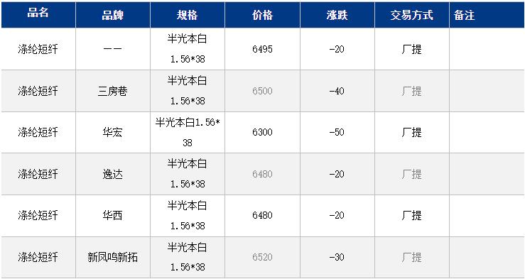 1.4D半光直紡滌綸短纖江浙商談重心6300-6700元/噸出廠或短送,福建主流商談6350-6550元/噸現(xiàn)款短送,山東、河北主流6450-6750元/噸送到。
