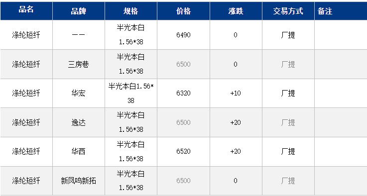 1.4D半光直紡滌綸短纖江浙商談重心6350-6700元/噸出廠或短送,福建主流商談6400-6550元/噸現(xiàn)款短送,山東、河北主流6500-6750元/噸送到。