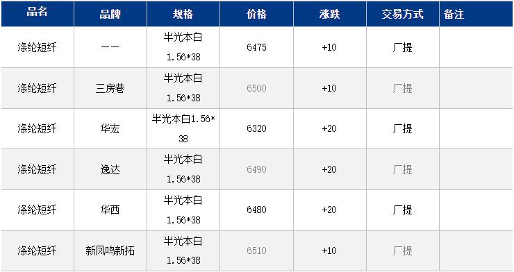 1.4D半光直紡滌綸短纖江浙商談重心6300-6700元/噸出廠或短送,福建主流商談6400-6500元/噸現(xiàn)款短送,山東、河北主流6450-6750元/噸送到。