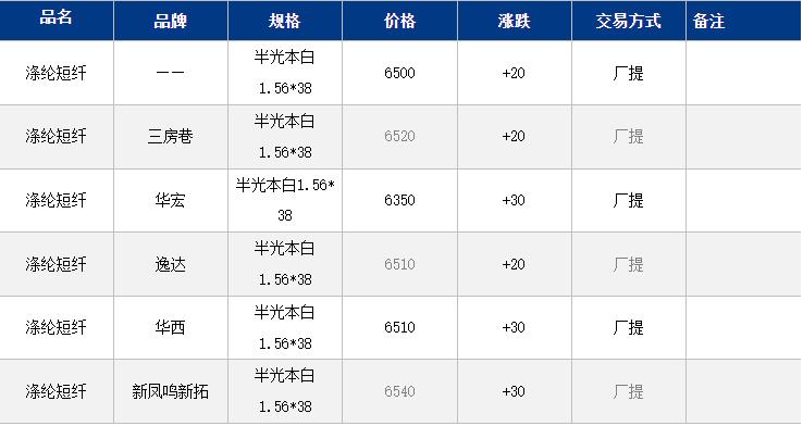 江蘇滌綸短纖現(xiàn)貨價(jià)格上漲20元在6500元/噸。PX上漲帶來(lái)較強(qiáng)成本支撐,短纖期現(xiàn)貨價(jià)格小幅跟進(jìn),但需求好轉(zhuǎn)仍不明顯,短纖現(xiàn)貨漲幅不及盤(pán)面。目前現(xiàn)貨主流6500-6540元/噸自提,偏低6350元/噸附近。