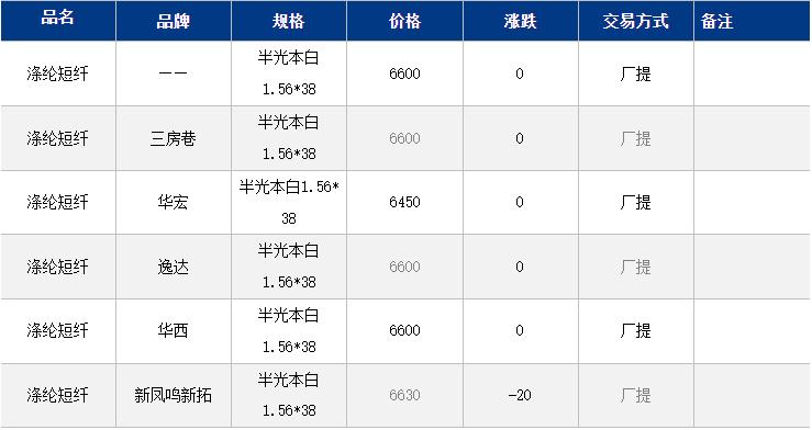 1.4D半光直紡滌綸短纖福建主流商談6550-6650元/噸現(xiàn)款短送,山東、河北主流6650-6850元/噸送到。