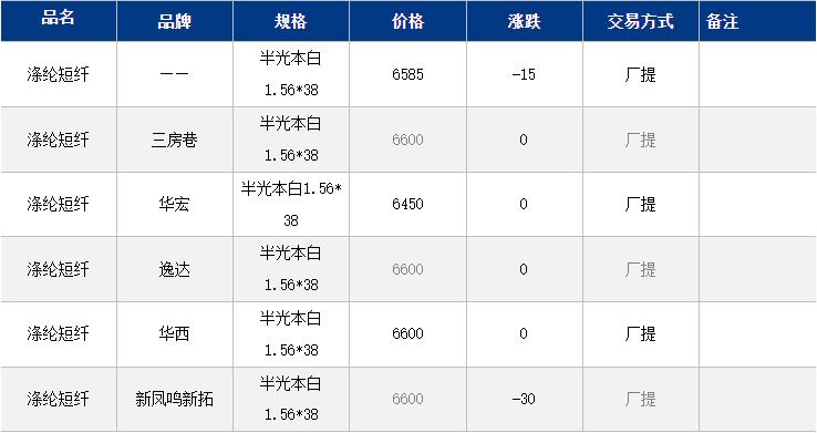 1.4D半光直紡滌綸短纖江浙商談重心6500-6750元/噸出廠或短送,福建主流商談6550-6650元/噸現(xiàn)款短送,山東、河北主流6650-6850元/噸送到。