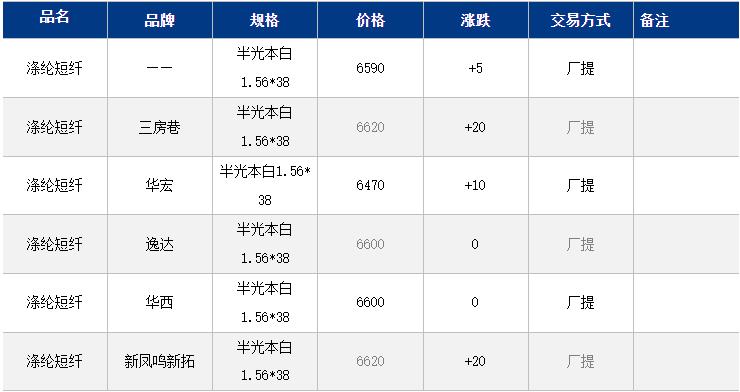 1.4D半光直紡滌綸短纖江浙商談重心6500-6800元/噸出廠或短送,福建主流商談6600-6800元/噸現(xiàn)款短送,山東、河北主流6650-6850元/噸送到。