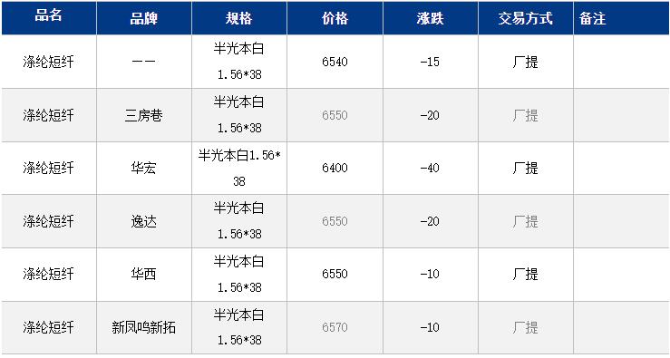 1.4D半光直紡滌綸短纖江浙商談重心6400-6750元/噸出廠或短送,福建主流商談6450-6650元/噸現(xiàn)款短送,山東、河北主流6500-6800元/噸送到。