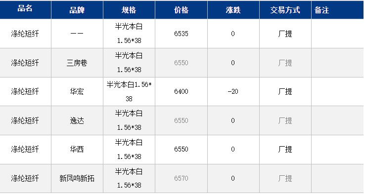 1.4D半光直紡滌綸短纖江浙商談重心6400-6750元/噸出廠或短送,福建主流商談6400-6600元/噸現(xiàn)款短送,山東、河北主流6500-6800元/噸送到。