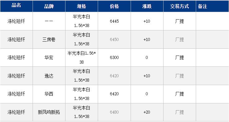 江蘇滌綸短纖現(xiàn)貨價格上漲10元至6445v。原油、PX盤中上漲帶動短纖期現(xiàn)貨價格小幅上漲,早間現(xiàn)貨主流6430-6500元/噸自提,偏低6300元/噸自提。