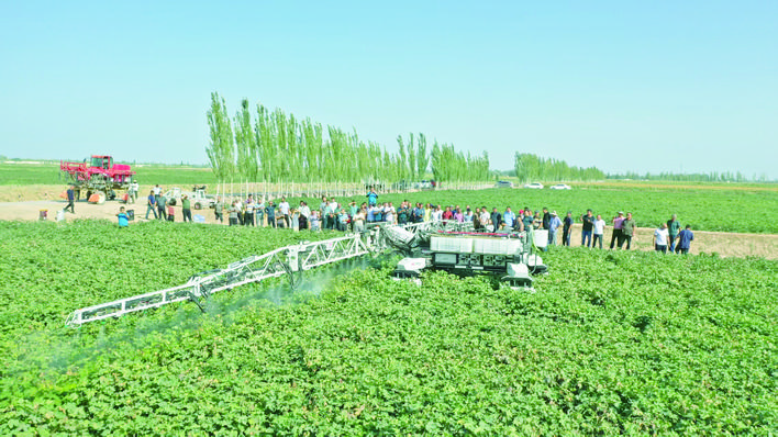 9月8日,在柯坪縣啟浪鄉(xiāng)布拉克村的棉花創(chuàng)建示范田內(nèi),一臺智能噴施機(jī)器人沿著田壟勻速前行,細(xì)密的霧狀脫葉劑均勻噴灑在棉株葉片上。不遠(yuǎn)處,3架植保無人機(jī)在棉田上空靈活穿梭,很快就完成精準(zhǔn)噴施作業(yè)。