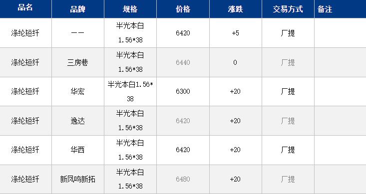 1.4D半光直紡滌綸短纖江浙商談重心6300-6550元/噸出廠或短送,福建主流商談6350-6450元/噸現(xiàn)款短送,山東、河北主流6450-6650元/噸送到。