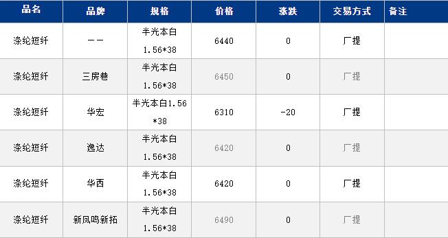 1.4D半光直紡滌綸短纖江浙商談重心6350-6550元/噸出廠或短送,福建主流商談6350-6450元/噸現(xiàn)款短送,山東、河北主流6450-6650元/噸送到。