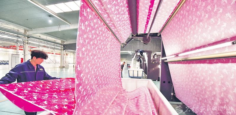 10月9日,工人在位于庫爾勒經(jīng)濟技術(shù)開發(fā)區(qū)的新疆德利家紡印染科技有限公司數(shù)碼印花車間查看產(chǎn)品。當日,該公司日產(chǎn)50萬米智能化數(shù)碼印花項目投產(chǎn),標志著該開發(fā)區(qū)紡織服裝產(chǎn)業(yè)在智能化、綠色化、全產(chǎn)業(yè)鏈發(fā)展上邁出關(guān)鍵一步。