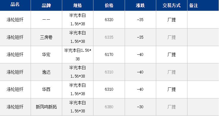 1.4D半光直紡滌綸短纖江浙商談重心6150-6450元/噸出廠或短送,福建主流商談6200-6400元/噸現(xiàn)款短送,山東、河北主流6250-6550元/噸送到。