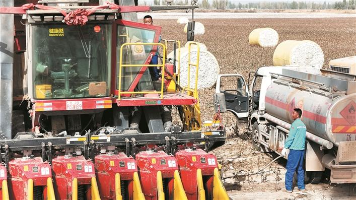 10月17日,一師阿拉爾市石油有限公司員工在十六團棉田里為采棉機加油。進(jìn)入棉花采收季,該公司積極開展全覆蓋、全天候配送服務(wù),確保采棉機“不斷油”,助力棉花快速采收、朵絮歸倉。