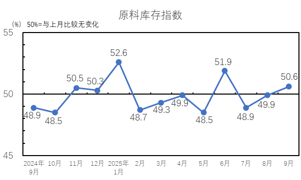 2025年9月,原料庫存指數(shù)為50.6%,高于臨界點,較8月上升0.7個百分點,行業(yè)主要原料庫存量上升。9月,紡織廠棉花庫存較8月上升,棉花庫存量指數(shù)為50.6%,較8月上升0.4個百分點;紡織廠非棉纖維庫存較8月上升,非棉纖維庫存量指數(shù)為50.7%,較8月上升1.1個百分點,棉花庫存量指數(shù)和非棉纖維庫存量指數(shù)高于臨界點。