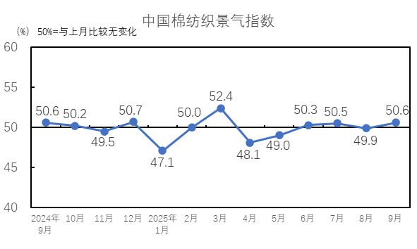 2025年9月,生產(chǎn)指數(shù)為51.1%,高于臨界點,較8月上升1.2個百分點,紡織廠生產(chǎn)情況較8月上升。從分項指數(shù)看,棉紡織廠設備開臺率指數(shù)為51.6%,高于臨界點,較8月上升2.3個百分點。紗產(chǎn)量指數(shù)為49.8%,較8月下降1.3個百分點;布產(chǎn)量指數(shù)為51.7%,較8月上升2.3個百分點;紗產(chǎn)量指數(shù)低于臨界點,布產(chǎn)量指數(shù)高于臨界點。