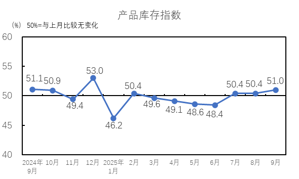 2025年9月,產(chǎn)品庫存指數(shù)為51.0%,高于臨界點,較8月上升0.6個百分點,紡織廠產(chǎn)品庫存量下降。紗庫存量指數(shù)為51.5%,較8月上升1.5個百分點;布庫存量指數(shù)為50.2%,較8月下降0.8個百分點。紗庫存量指數(shù)和布庫存量指數(shù)高于臨界點。