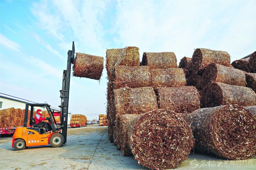 在位于烏蘇市的中城宏澤(新疆)生物科技有限公司,工人駕駛叉車碼放棉花秸稈(10月29日攝)。該公司以棉花秸稈為生產(chǎn)原料,制作全生物降解地膜、水稻專用膜、大棚膜等,讓當(dāng)?shù)?80多萬畝棉花秸稈有了新用途。