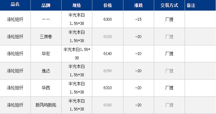 1.4D半光直紡滌綸短纖江浙商談重心6200-6450元/噸出廠或短送,福建主流商談6250-6400元/噸現(xiàn)款短送,山東、河北主流6250-6500元/噸送到。