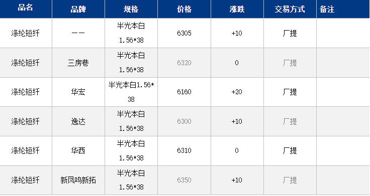 1.4D半光直紡滌綸短纖江浙商談重心6200-6450元/噸出廠或短送,福建主流商談6250-6400元/噸現(xiàn)款短送,山東、河北主流6300-6500元/噸送到。
