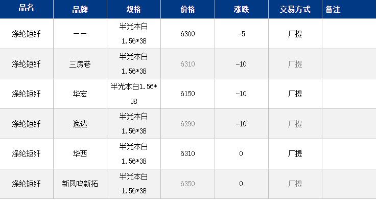 江蘇滌綸短纖現(xiàn)貨價格下跌5元到6300元/噸;早間短纖期現(xiàn)貨價格窄幅偏弱震蕩,現(xiàn)貨主流6290-6350元/噸自提,偏低6150元/噸附近自提。