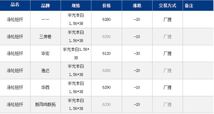 1.4D半光直紡滌綸短纖江浙商談重心6250-6400元/噸出廠或短送,福建主流商談6250-6400元/噸現(xiàn)款短送,山東、河北主流6350-6500元/噸送到。