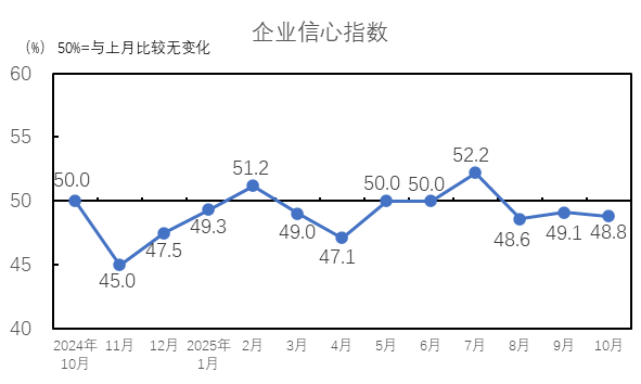 2025年10月,企業(yè)信心指數為48.8%,較9月下降0.3個百分點,企業(yè)信心指數低于臨界點,對未來市場的信心不足。10月,市場維持旺季不旺態(tài)勢,企業(yè)經營下滑,且隨著10月結束,市場進入淡季,企業(yè)對未來行情的預期降低。