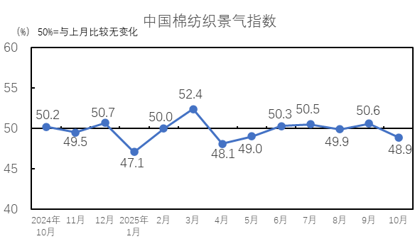 中國棉紡織景氣指數出現回落。10月中國棉紡織景氣指數為48.9%,低于臨界點,較9月下降1.7個百分點。10月,國慶節(jié)前鄭棉持續(xù)下降,市場存在買漲不買跌心態(tài),疊加新棉豐產預期使棉價承壓,抑制整個產業(yè)鏈的消費,且下游市場傳統(tǒng)旺季預期兌現不佳,市場心態(tài)偏空,企業(yè)經營下滑,對未來市場的預期下降。從分項指數看,構成中國棉紡織景氣指數的7個分項指數中,產品庫存指數高于臨界點,其余指數低于臨界點。7個分項指數均較9月出現下降。