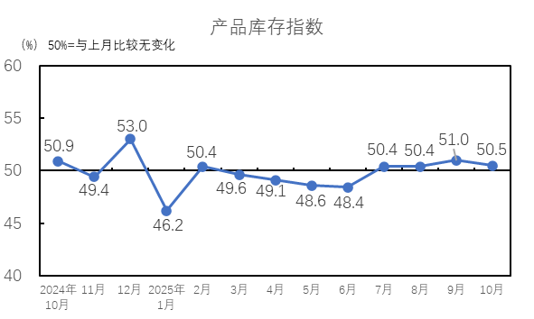 2025年10月,產品庫存指數為50.5%,高于臨界點,較9月下降0.5個百分點,紡織廠產品的庫存量下降。紗庫存量指數為49.6%,較9月下降1.9個百分點;布庫存量指數為51.9%,較9月上升1.7個百分點。紗庫存量指數低于臨界點,布庫存量指數高于臨界點。